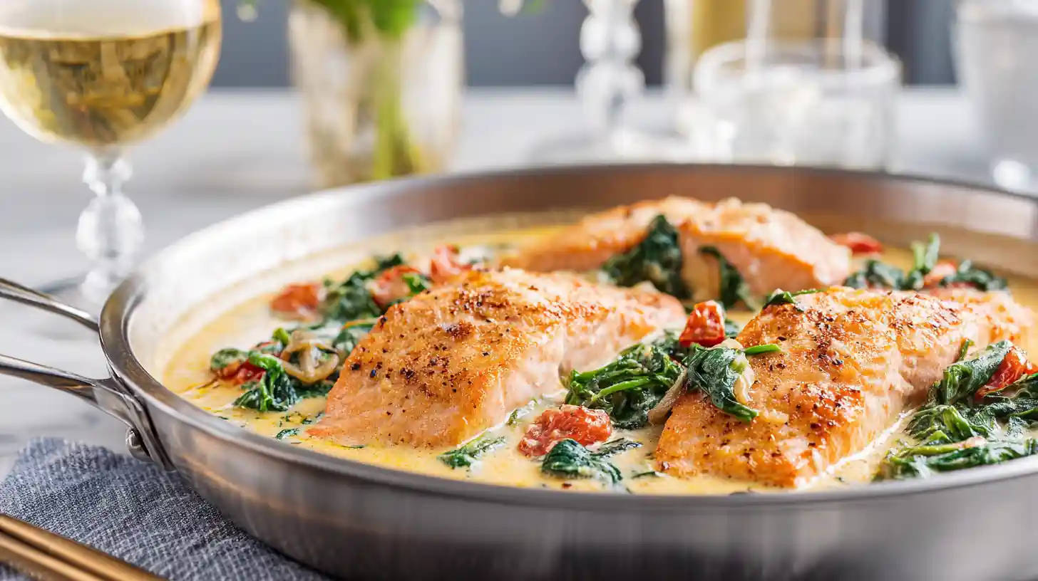 Creamy Tuscan Salmon made in one skillet with garlic, sun-dried tomatoes, spinach, and a rich cream sauce.