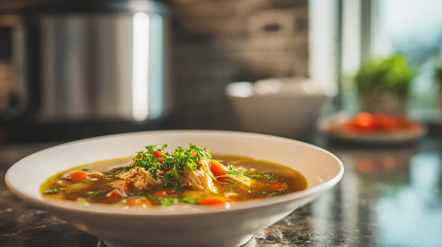 A light, soothing chicken soup with clear broth, tender chicken, and simple vegetables, perfect for cozy winter meals.