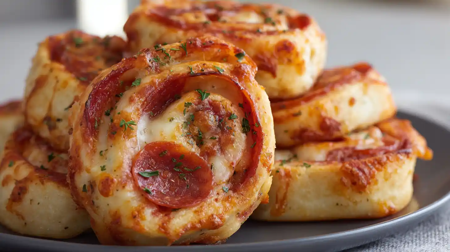 Cheesy baked pizza roll-ups filled with mozzarella, turkey pepperoni, and classic pizza sauce.